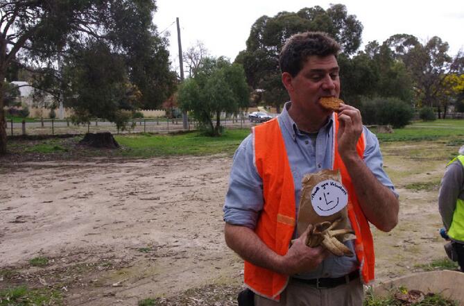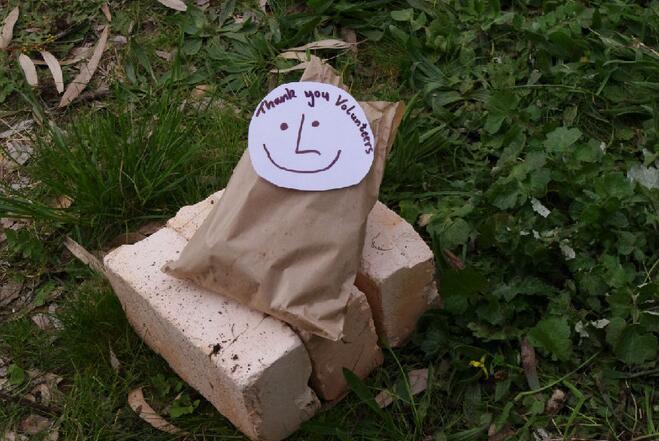 原來今天的工作地點附近有一所州立小學,學校的老師將課堂變為戶外實踐活動,特地組織班上的小朋友參與到我們的義工隊伍當中,並給志願者們送來餅乾。